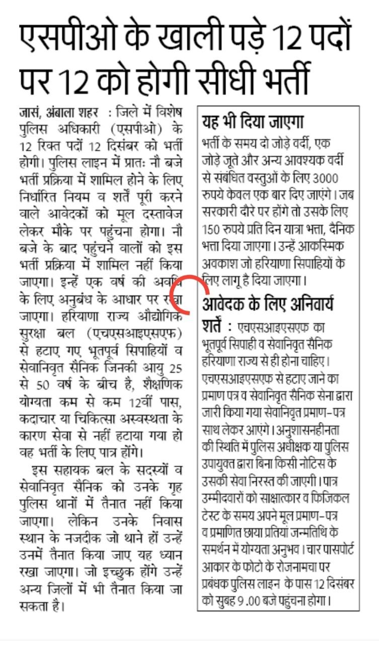- Q: What is the last date to submit the application for Ambala Police SPO Recruitment?A: The last date for submitting applications is December 12, 2023. Ensure that you complete the application process before this deadline.