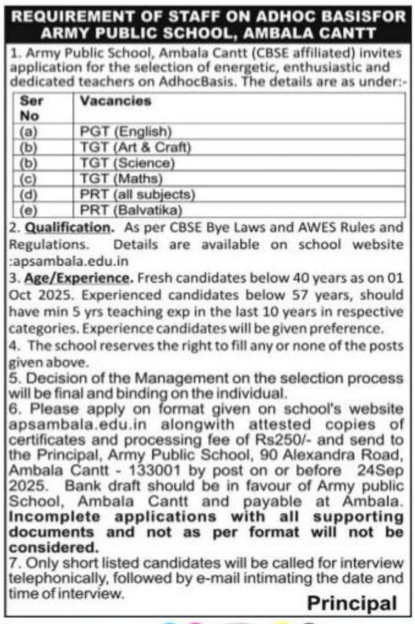 Army Public School Ambala Vacancy 2025: The Army Public School, Ambala, has released a notification for the PRT, TGT, PGT Teaching Staff posts. All interested and eligible candidates must read the notification carefully and submit their applications before the prescribed deadline.