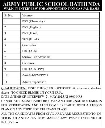 Army Public School Bathinda Recruitment 2025: The prestigious Army Public School (APS), Bathinda, has released a notification inviting eligible candidates for walk-in interviews for various teaching and non-teaching positions on a casual basis. This is an excellent opportunity for experienced and aspiring educators, as well as support staff, to be a part of one of Punjab’s leading academic institutions.