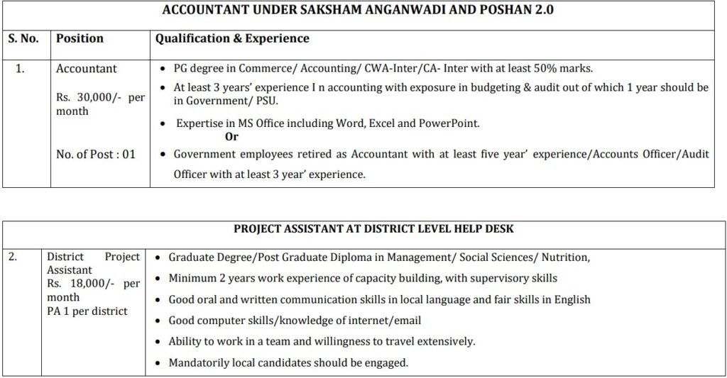 | District Project Assistant | Graduate Degree/Post Graduate Diploma in Management/ Social Sciences/ Nutrition. |