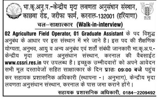 - Interested candidates are required to submit their applications along with all original documents to the Assistant Administrative Officer (Establishment Section), Central Soil Salinity Research Institute, Karnal at 09:00 AM on the day of the interview.