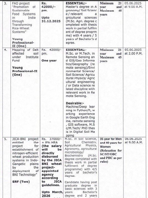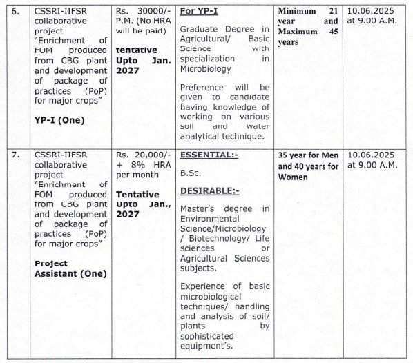 CSSRI, Karnal Recruitment 2025: The ICAR- Central Soil Salinity Research Institute, Karnal Interview for the post of 02 Field/Lab Attendant, 02 Young Professional-II, 01 JRF, 01 Young Professional, 01 Project Assistant, and 02 SRF in the below-mentioned projects will be held at this institute on contract basis which will end simultaneously with the project. Eligible candidates are invited to appear before the Selection Committee as per the date and time scheduled for an interview at ICAR-CSSRI, Karnal as per the details given below:-