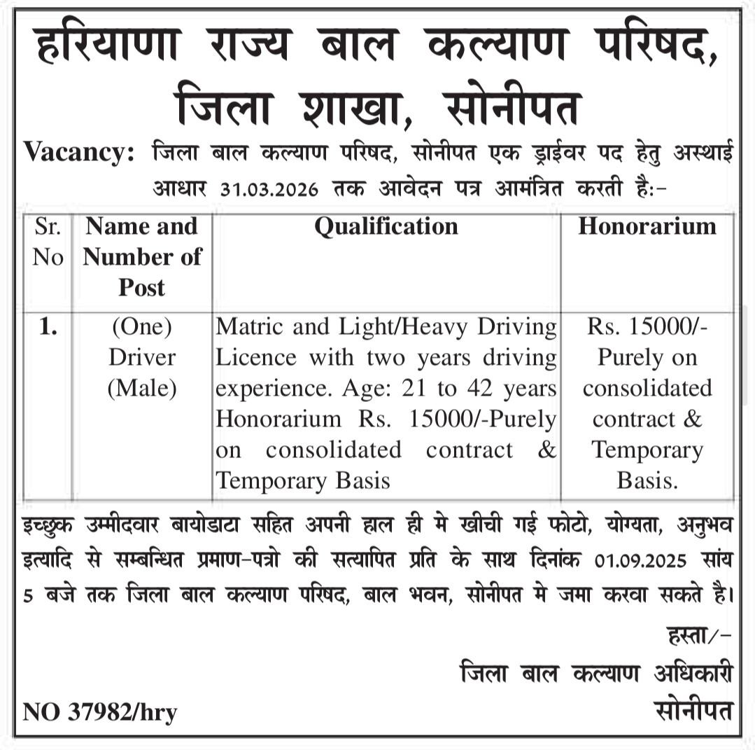 District Child Welfare Council Sonipat Recruitment 2025: The District Child Welfare Council Sonipat has released a notification for the Driver posts. All interested and eligible candidates must read the notification carefully and submit their applications before the prescribed deadline.