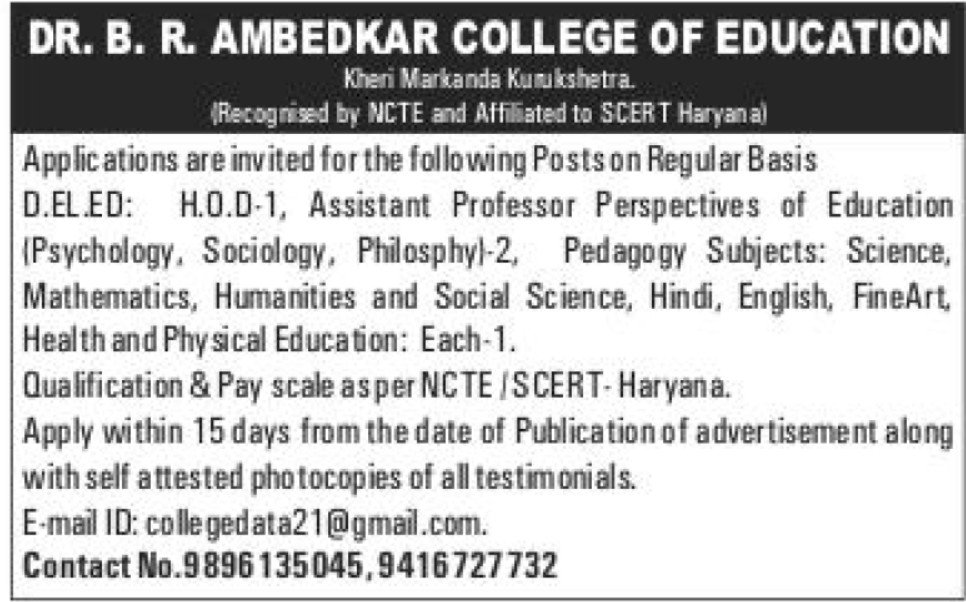 Dr. B.R. Ambedkar College of Education Recruitment 2026: अगर आप टीचिंग फील्ड में करियर बनाना चाहते हैं, तो Dr. B. R. Ambedkar College of Education, Kurukshetra (Haryana) ने विभिन्न पदों पर भर्ती के लिए आवेदन आमंत्रित किए हैं। यह भर्ती Regular Basis पर की जा रही है और इसमें D.El.Ed, Assistant Professor और अन्य शैक्षणिक पद शामिल हैं। यह अवसर उन उम्मीदवारों के लिए खास है जो शिक्षा क्षेत्र में स्थायी नौकरी की तलाश कर रहे हैं।