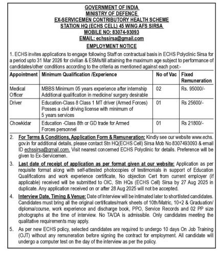 ECHS Sirsa Vacancies 2025: The Ex-serviceman Contributory Health Scheme (ECHS) has released a notification to fill Driver and Chowkidar posts. All interested, eligible candidates are advised to read the notification carefully and submit their applications before the prescribed deadline.