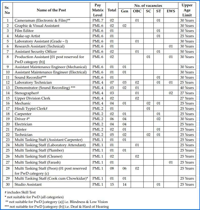 Studio Assistant:- 10th Passed. Multi Tasking Staff (Cook cum Chowkidar):- 10th passed with six months experience as Watchman / Security Guard / Hostel / Guest House. Multi Tasking Staff (Peon):- 10th Passed. Multi Tasking Staff (Farash):- 10th passed and should have working experience as a Farash. For Multi Tasking Staff (Cleaner):- 10th passed and should have working experience as a Cleaner. Multi Tasking Staff (Plumber):- 10th passed. Multi Tasking Staff (Laboratory Attendant):- 10th passed and should have worked as an Attendant in Laboratory. Multi Tasking Staff (Assistant Carpenter):- 10th passed and should have 2 years experience. Technician:- 10th passed and Certificate from ITI in Electric Wiring / Wireman license and 02 years experience. Painter:- 10th passed and should have 05 years experience. Electrician:- 10th passed and should have 02 years experience. Driver:- 10th passed and should have valid driving license for Heavy Duty Vehicle and should have 03 years experience. Carpenter:- 10th passed and should have 02 years experience. For Other Posts:- Please refer to Official Details Notice . All Govt Scheme All CSC form Click Here Click Here Total Post & Age 84