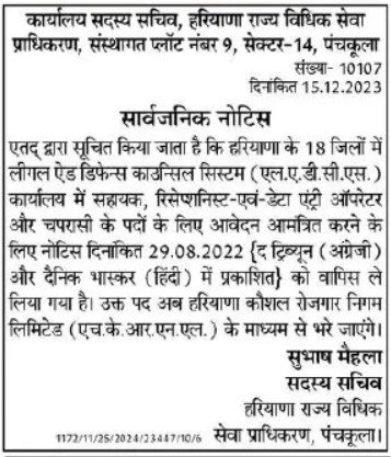 एतद् द्वारा सूचित किया जाता है कि हरियाणा के 18 जिलों में लीगल ऐड डिफेन्स काउन्सिल सिस्टम (एल.ए.डी.सी.एस.) कार्यालय में सहायक, रिसेप्शनिस्ट-एवं-डेटा एंट्री ऑपरेटर और चपरासी के पदों के लिए आवेदन आमंत्रित करने के लिए नोटिस दिनांकित 29.08.2022 [द ट्रिब्यून (अंग्रेजी) और दैनिक भास्कर (हिंदी) में प्रकाशित } को वापिस ले लिया गया है। उक्त पद अब हरियाणा कौशल रोजगार निगम लिमिटेड (एच.के. आर.एन.एल.) के माध्यम से भरे जाएंगे।
