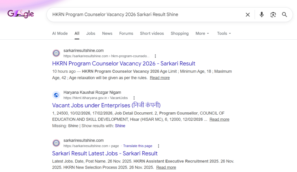 HKRN Program Counselor Vacancy 2026 Sarkari Result Shine