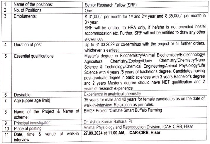 - walk-in interview 27.09.2024 at 11.00 AM,, ICAR-CIRB, Hisar