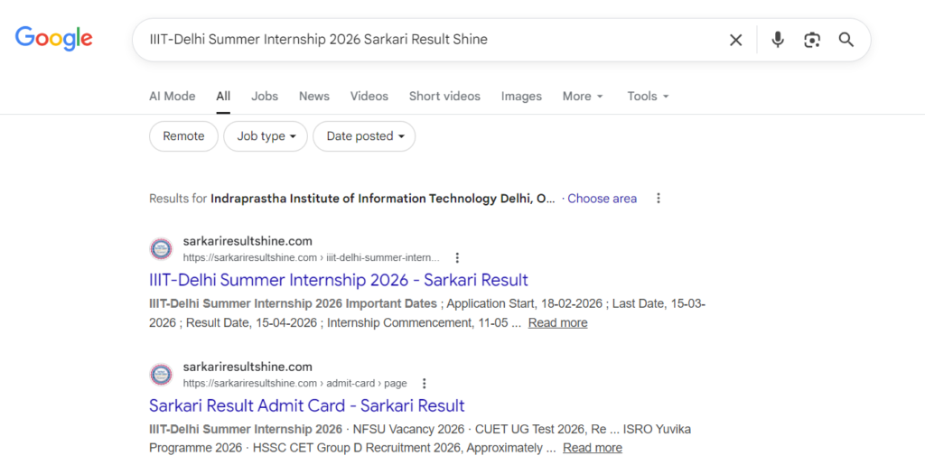 IIIT-Delhi Summer Internship 2026 Sarkari Result Shine