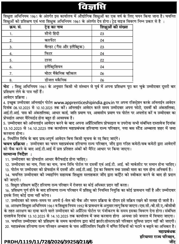 Jind Roadways Recruitment 2025: The General Manager Haryana Roadways, Jind has released a notification for the various posts. All interested and eligible candidates must read the Jind Roadways Recruitment 2025 notification carefully and submit their applications before the prescribed deadline. See all information related to Jind Roadways Recruitment 2025 Post on the official website www.apprenticeshipindia.gov.in. All the details related to the Jind Roadways Recruitment 2025 are given below.
