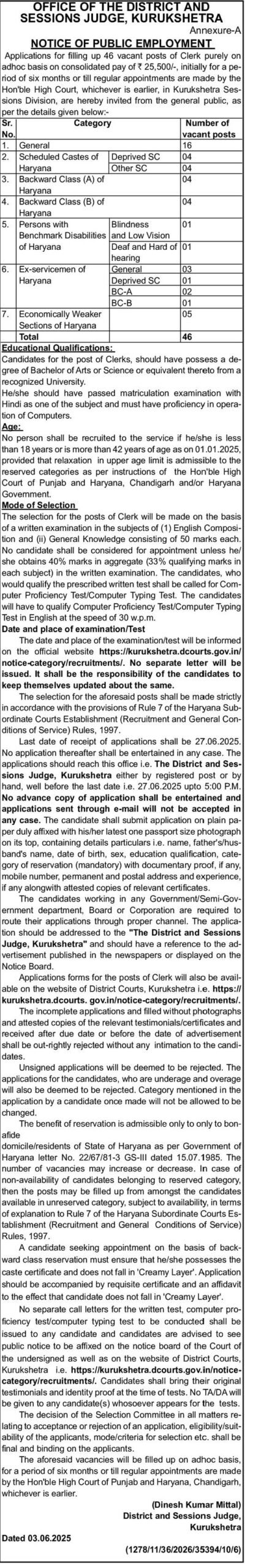 Kurukshetra Court Clerk Vacancy 2025 How To Apply
