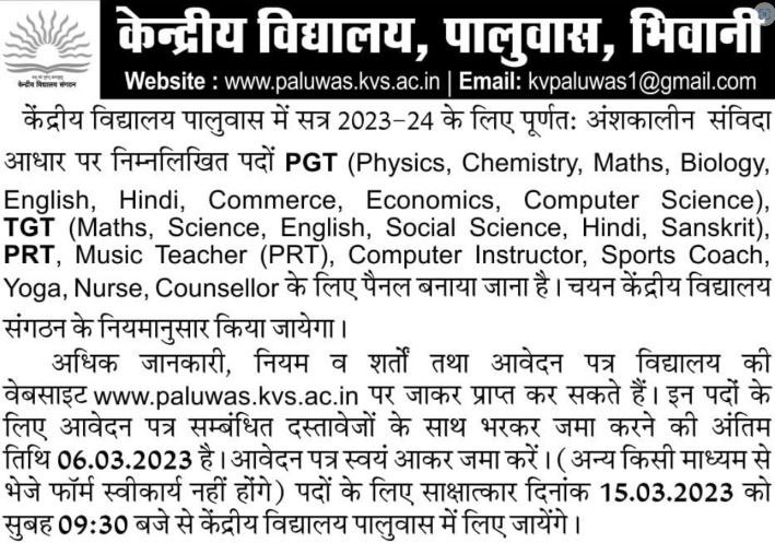 | How to Apply Eligible / Interested candidates can apply in prescribed application format on or before 03.03.2023 along with self attested copies of testimonials. The applicants need to be sent their filled application form to KENDRIYA VIDYALAYA, Paluwas, Bhiwani – 127021 | ||||||||