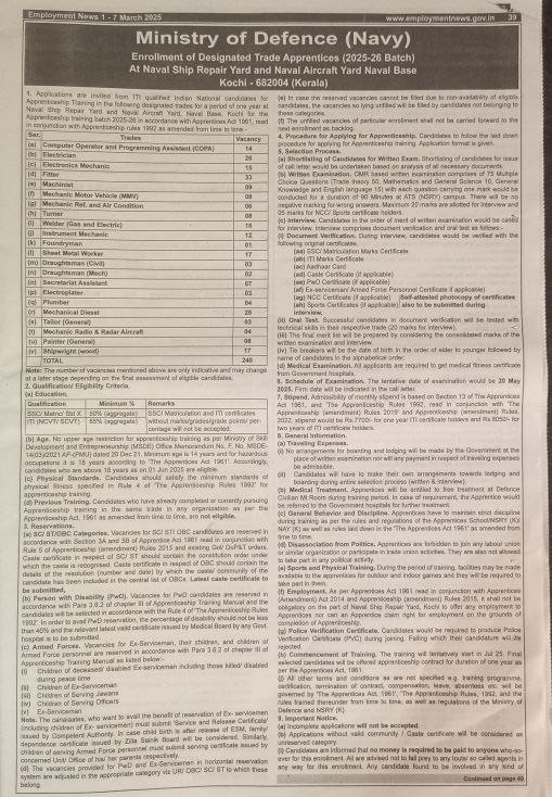 Navy Apprentice Jobs 2025: The Indian Navy has released a recruitment notification for 240 Trade Apprentice vacancies under its 2025 apprenticeship program. The short notification was published in the 1-7 July 2024 Employment Newspaper, and online applications will be accepted from February to March 2025.