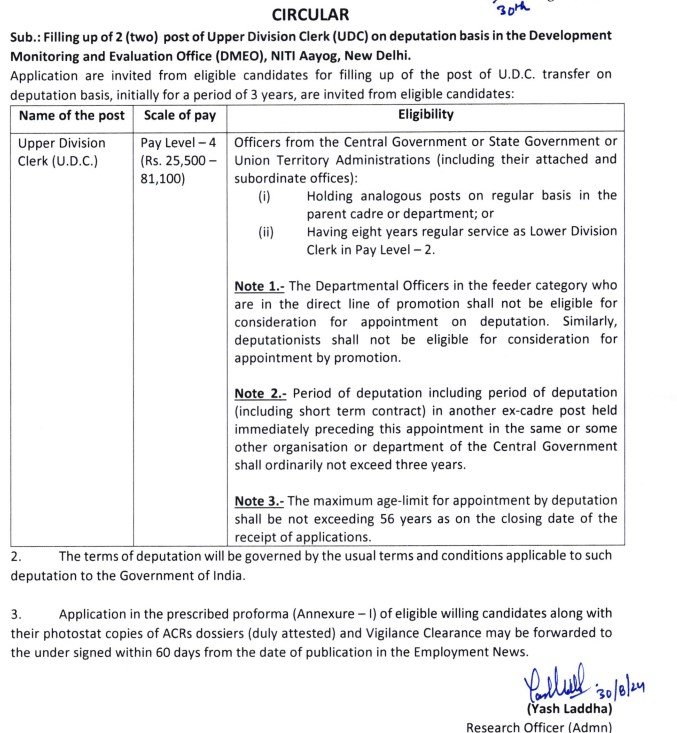 NITI Aayog New Vacancy Notification 2024: विकास निगरानी एवं मूल्यांकन कार्यालय (डीएमईओ), नीति आयोग, नई दिल्ली में प्रतिनियुक्ति के आधार पर अपर डिवीजन क्लर्क (यूडीसी) के 2 (दो) पदों को भरने के संबंध में। प्रतिनियुक्ति के आधार पर यूडीसी के पद को भरने के लिए पात्र उम्मीदवारों से आवेदन आमंत्रित किए जाते हैं, जो कि प्रारंभ में 3 वर्ष की अवधि के लिए होंगे।