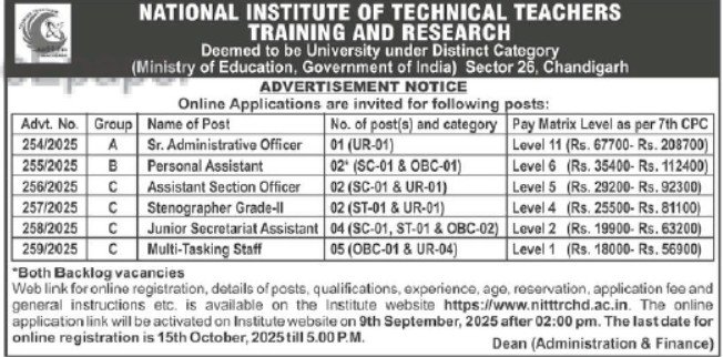 NITTTR Chandigarh Recruitment 2025: The National Institute of Technical Teachers Training and Research (NITTTR) has released a notification for the group A, B, and C posts. All interested and eligible candidates must read the notification carefully and submit their applications before the prescribed deadline.