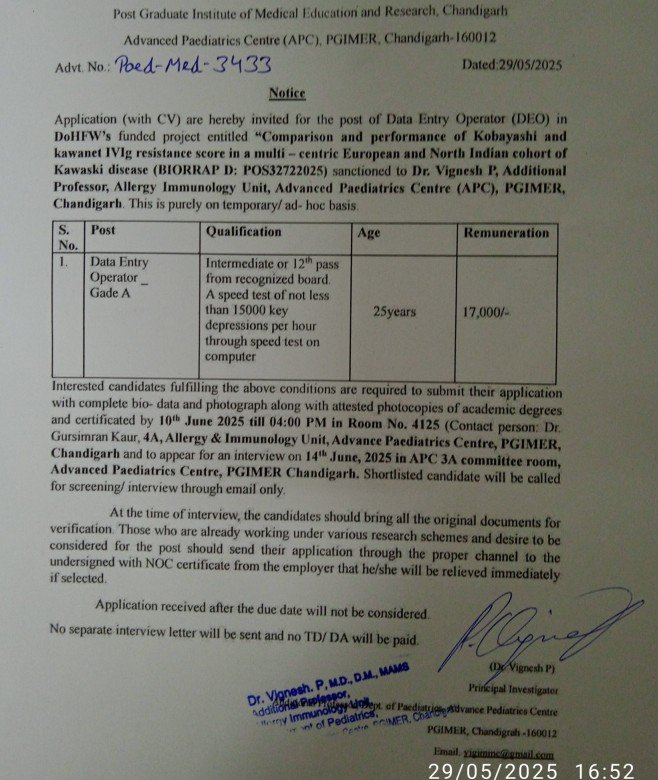 PGI Chandigarh DEO Vacancy 2025 How To Apply