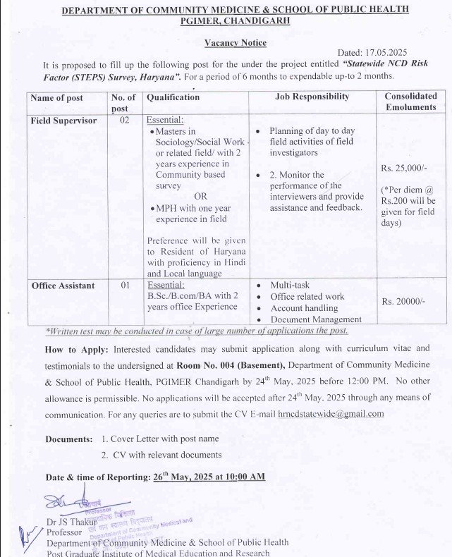 PGI Chandigarh Field Supervisor, Office Assistant Recruitment 2025 How to Apply