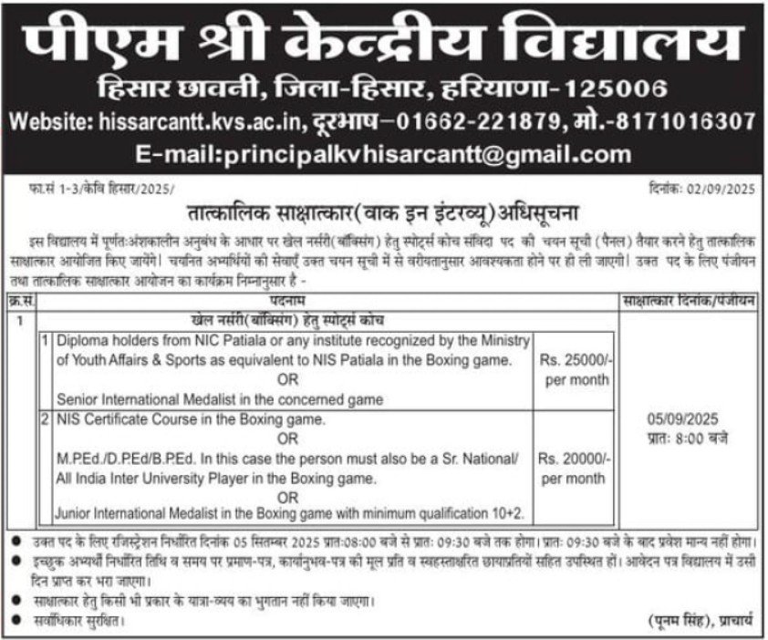 PM SHRI Kendriya Vidyalaya Hisar Vacancy 2025: The PM SHRI Kendriya Vidyalaya Hisar has released a notification for the various posts. All interested and eligible candidates must read the notification carefully and submit their applications before the prescribed deadline.
