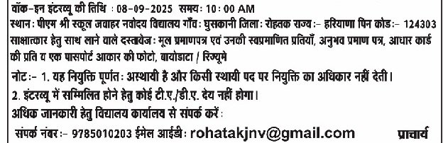 PM SHRI Kendriya Vidyalaya Rohtak Vacancy 2025: The PM SHRI Kendriya Vidyalaya Rohtak has released a notification for the various posts. All interested and eligible candidates must read the notification carefully and submit their applications before the prescribed deadline.
