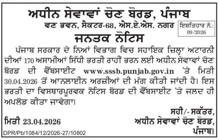 PSSSB Assistant District Attorney Recruitment 2026: Punjab Subordinate Services Selection Board द्वारा वर्ष 2026 के लिए Assistant District Attorney (ADA) पदों पर भर्ती का आधिकारिक नोटिफिकेशन जारी कर दिया गया है। यह भर्ती Punjab के Department of Home Affairs & Justice Punjab के अंतर्गत की जा रही है, जिसमें कुल 170 पदों को भरा जाएगा। यह भर्ती कानून (Law) के क्षेत्र में करियर बनाने वाले उम्मीदवारों के लिए एक शानदार अवसर है। इच्छुक और योग्य अभ्यर्थी निर्धारित तिथियों के अनुसार ऑनलाइन आवेदन कर सकते हैं और इस सरकारी नौकरी का लाभ उठा सकते हैं।