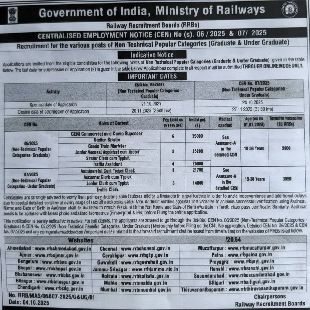 RRB NTPC Recruitment 2025-26: The Railway Recruitment Board (RRB) has released a notification for the Station Master, Goods Guard, Commercial Clerk, Accounts Clerk, Junior Typist, Trains Clerk, Senior Clerk cum Typist, Traffic Assistant, and more posts. All interested and eligible candidates must read the RRB NTPC Recruitment 2025-26 notification carefully and submit their applications before the prescribed deadline. All the details related to RRB NTPC Recruitment 2025-26 are given below.