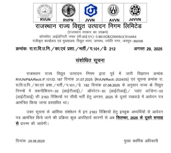 RVUNL Recruitment 2025: The Rajasthan Rajya Vidyut Utpadan Nigam Ltd has released a notification for the Technician posts. All interested and eligible candidates must read the notification carefully and submit their applications before the prescribed deadline.