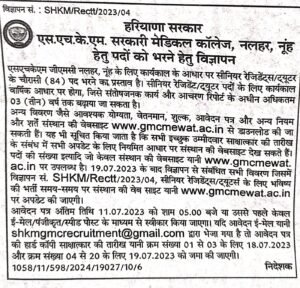 अन्य विवरण जैसे आवश्यक योग्यता, वेतनमान, शुल्क, आवेदन पत्र और अन्य नियम और शर्तें संस्थान की वेबसाइट www.gmcmewat.ac.in से डाउनलोड की जा सकती हैं। यह भी सूचित किया जाता है कि सभी इच्छुक उम्मीदवार साक्षात्कार की तारीख के संबंध में सभी अपडेट के लिए नियमित आधार पर संस्थान की वेबसाइट देख सकते हैं। पदों की संख्या इत्यादि जो केवल संस्थान की वेबसाइट यानी www.gmcmewat. ac.in पर उपलब्ध है। 19.07.2023 के बाद विज्ञापन से संबंधित सभी विवरण जिसमें विज्ञापन सं. SHKM / Rectt/2023/04, सीनियर रेजिडेंट्स / ट्यूटर्स के लिए भविष्य की भर्ती समय-समय पर संस्थान की वेब साइट यानी www.gmcmewat.ac.in पर अपडेट की जाएगी।