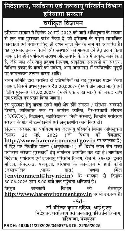 हरियाणा सरकार का पर्यावरण एवं जलवायु परिवर्तन विभाग अधिसूचना दिनांक 20 मई, 2022 (जो विभाग की वेबसाइट http://www.harenvironment.gov.in पर उपलब्ध है) में दिए गए निर्धारित प्रारूप (अनुबंधक-1) में “दर्शन लाल जैन राज्य पर्यावरण संरक्षण पुरस्कार” हेतु नामांकन आमंत्रित कर रहा है। नामांकन निदेशक, पर्यावरण एवं जलवायु परिवर्तन विभाग, बेज नं. 55-58, दूसरी मंजिल, सेक्टर-2, पंचकूला, हरियाणा के कार्यालय में हार्ड कॉपी (हस्तचालित / डाक द्वारा) अथवा ईमेल (environment@hry.nic.in) के माध्यम से दिनांक 30.06.2025 शाम 5.00 बजे तक पहुँचना अनिवार्य है। विस्तृत जानकारी विभाग की वेबसाइट http://www.harenvironment.gov.in पर भी उपलब्ध है।