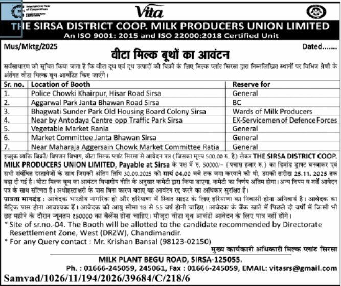 Important Dates of Sirsa Vita Milk Distributors Stores Open 2025