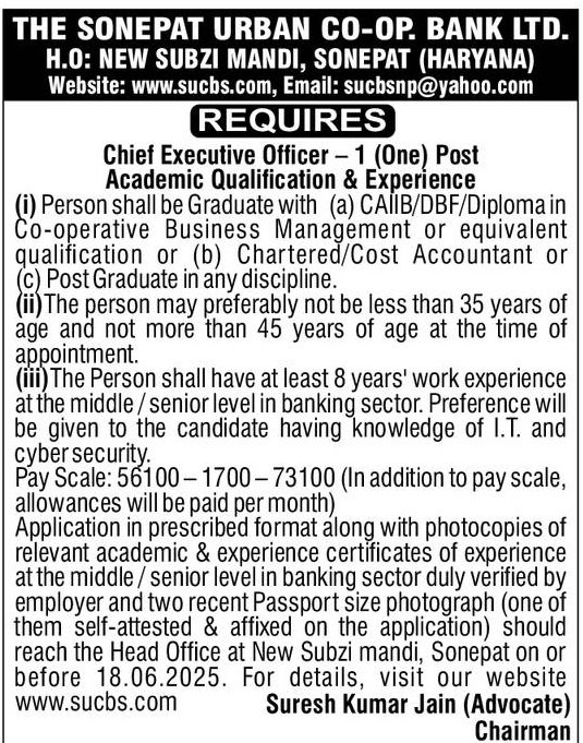 - Post Application: Send to: Application in prescribed format along with photocopies of relevant academic & experience certificates of experience at the middle/senior level in the banking sector duly verified by the employer and two recent Passport size photographs (one of them self-attested & affixed on the application) should reach the Head Office at New Subzi Mandi, Sonepat on or before 18.06.2025. For details, visit our website www.sucbs.com