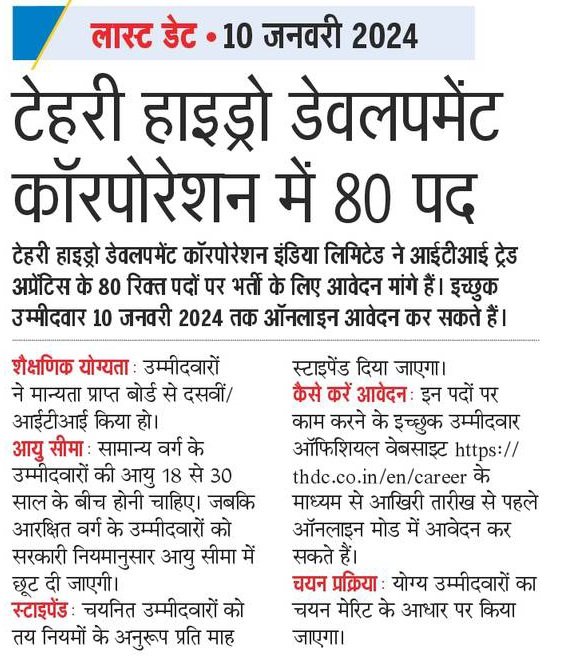 THDC Recruitment 2023-24: Short Details : Tehri Hydro Development Corporation India Limited has recently released a notification for the recruitment of Apprentice Posts in 2023. The Department invites all interested and eligible candidates to read the complete notification carefully and submit their applications before the specified deadline. To gain a complete understanding of this recruitment, it is important to review the advertisement for details of pay scale, physical eligibility criteria, age limit, selection process, job description and any other relevant information.