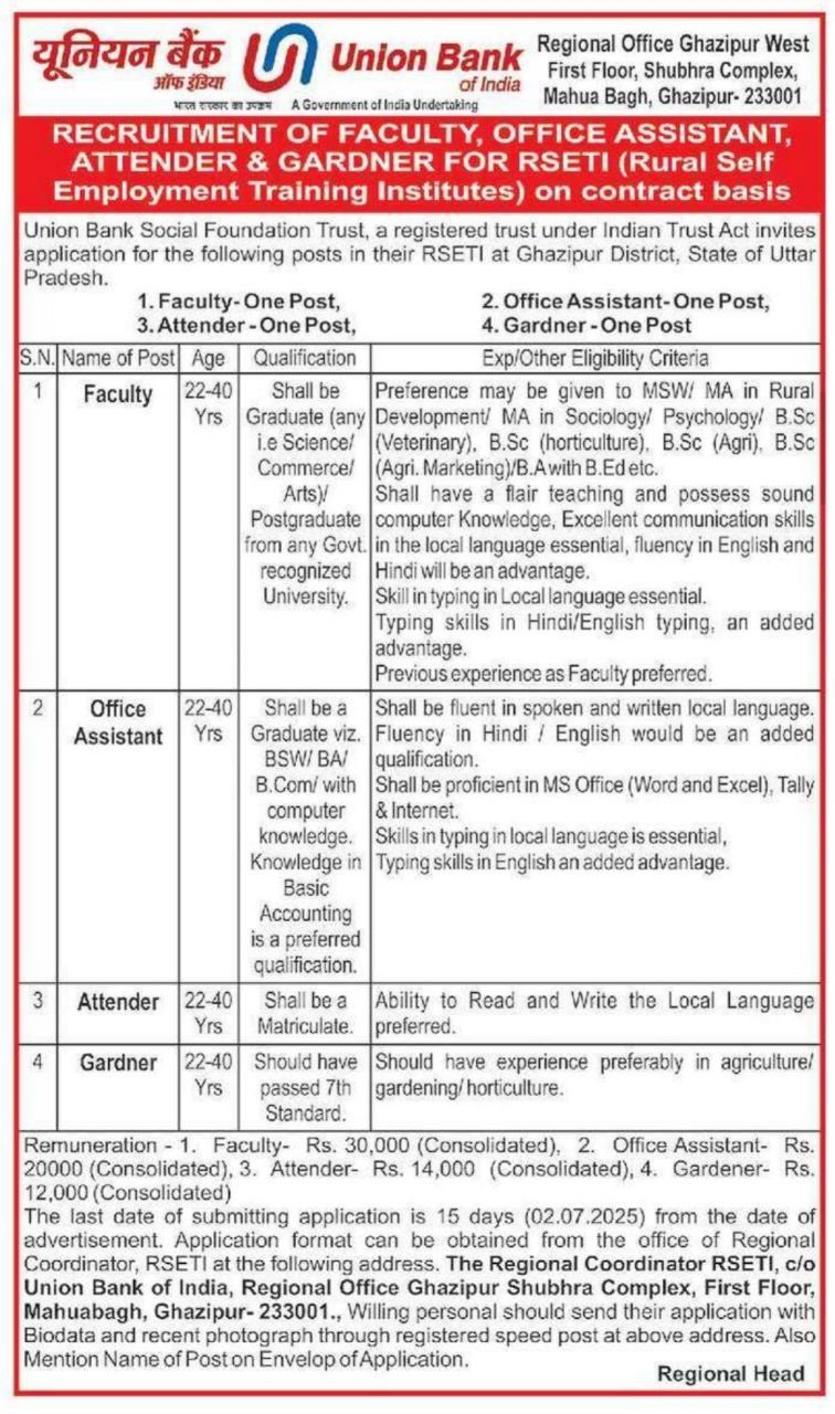 Union Bank of India Recruitment 2025: The Union Bank of India has released a notification to fill Faculty, Office Assistant, Attendant, and Gardener posts. All interested eligible candidates are advised to read the entire notification carefully and submit their application before the prescribed deadline.