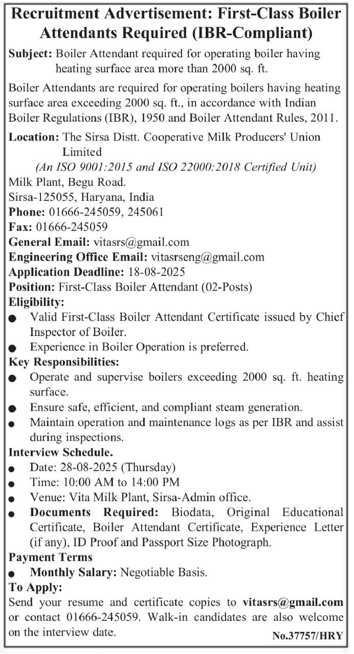 Vita Milk Plant Sirsa Recruitment 2025: The Vita Milk Plant Sirsa has released a notification for the First Class Boiler Attendant posts. All interested and eligible candidates must read the notification carefully and submit their applications before the prescribed deadline.